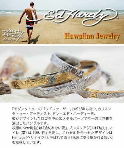 【商品】新作 Ed Hardy エドハーディー EDHARDY 公式ライセンス ステンレス ハワイアンジュエリー ペアバングル ブレスレットEDSF-BANGLE2【素材】ステンレス316L【色】EDSF-207:シルバー×イエローゴールド/ EDSF-208:シルバー×ピンクゴールド【サイズ】EDSF-207 本体約:幅6.7cm×高さ0.7cm×厚み0.3cm/EDSF-208 本体約:幅6.0cm×高さ0.7cm×厚み0.3cm【付属品】Ed Hardy オリジナルジュエリーケース、Ed Hardy オリジナル巾着ポーチ【ご注文について】掲載価格はチェーン1点分です。
